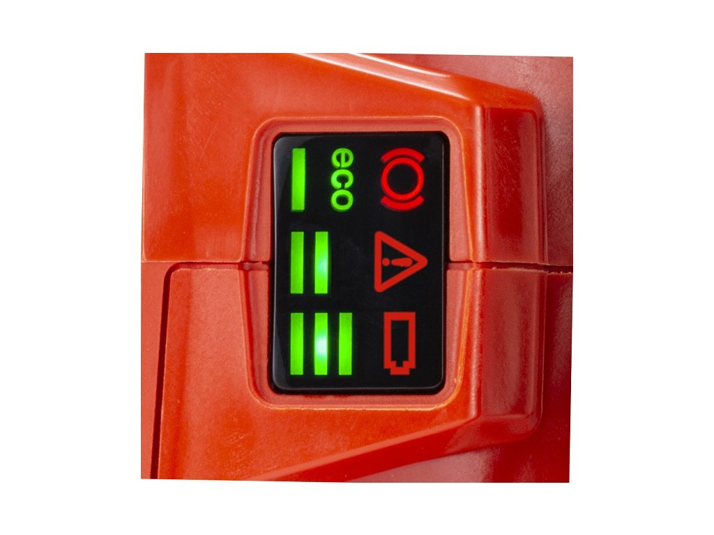 - Indikace vybití akumulátoru, přetížení/přehřátí stroje, spuštění řetězové brzdy nebo zvolené rychlosti