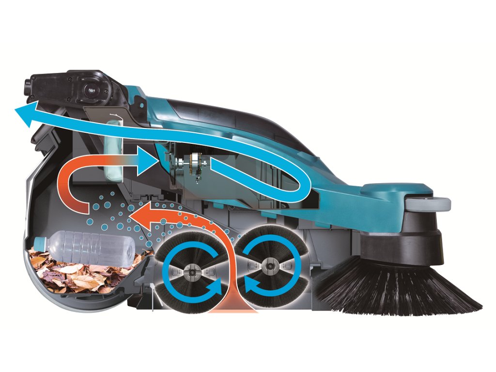 - Spolehlivý úklid je zaručený použitím dvou výkonných středových kartáčů, bočního kartáče a možností zapnutí vysávání.
