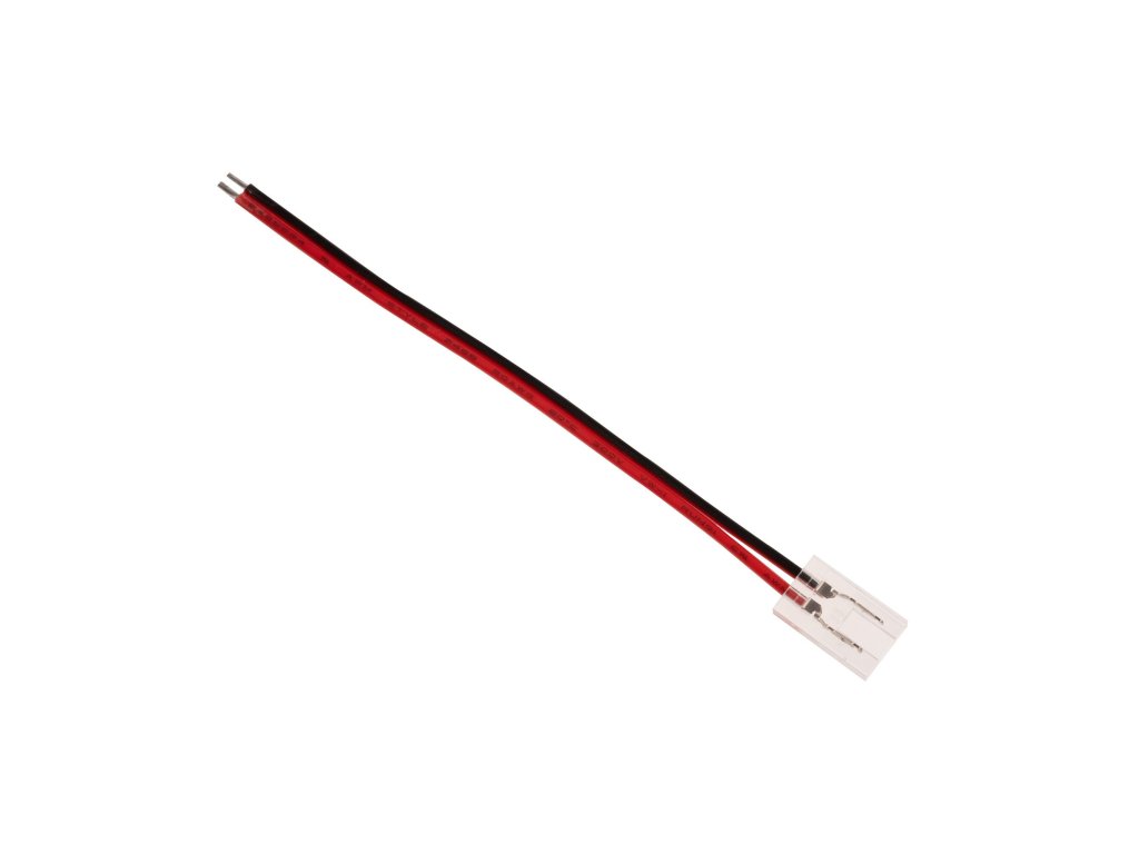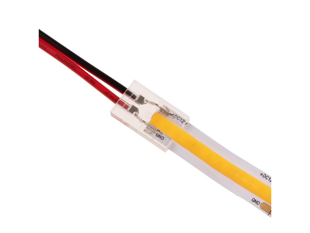 COB přípojka s kabelem je určena pouze pro 8mm jednobarevné COB LED pásky. Přípojka se na LED pásek nasadí a pomocí kleští se přitlačí kontaktní trny do LED pásku, kdy se trny poté do LED pásku zaříznou. Přípojka je tedy určena pro jedno použití. Rozměr jedné přípojky (kostičky) je 10x16mm. Maximální proudové zatížení 5A. Pro použití přípojky do LED profily dejte pozor na vnitřní rozměry profily, aby se přípojka do profilu vešla.Specifikace