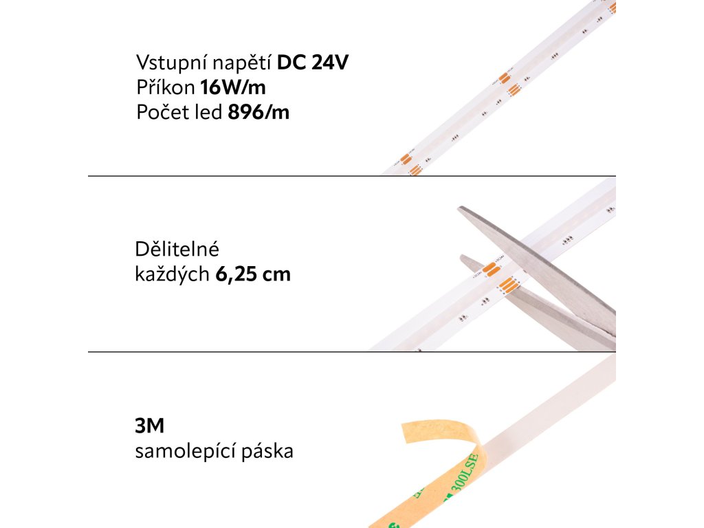 LED pásek COB RGB a denní bílá, 24V, 16W/m, 896LED/m, záruka 3 roky