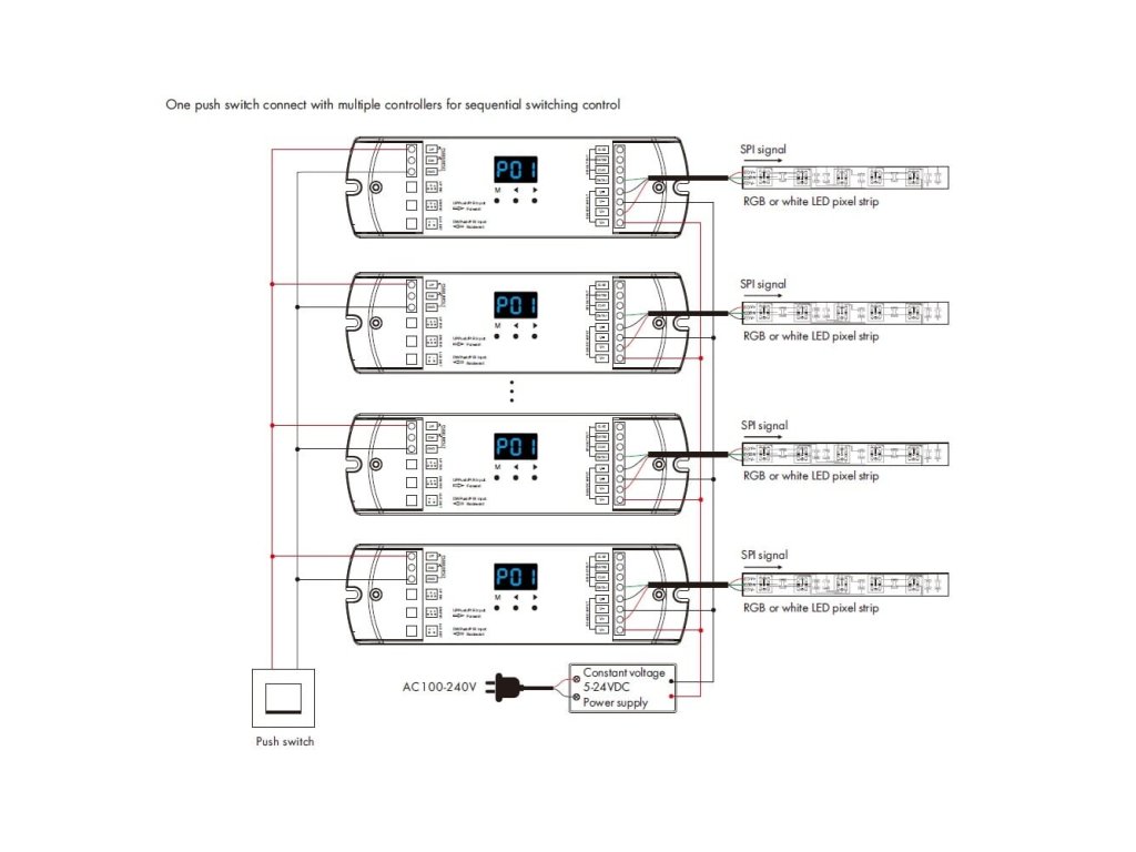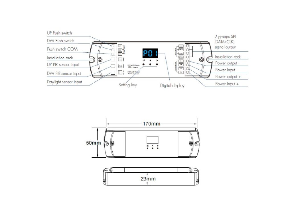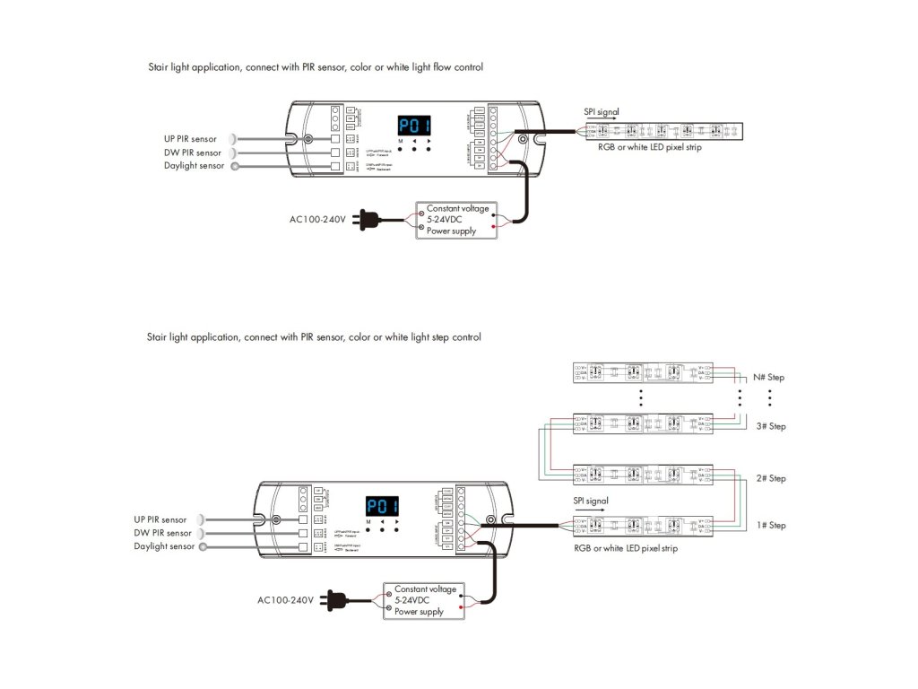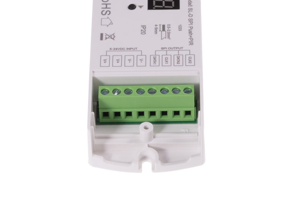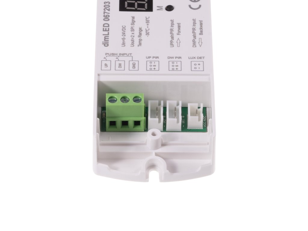 Ovladač nabízí široké možnosti nastavení a efektů digitálních SPI LED pásků. Díky PIR senzorům můžete aktivovat nastavené světelné efekty při zaznamenání pohybu. K ovladači lze připojit až dva PIR senzory, což umožňuje snímat pohyb ve dvou částech místnosti. Toto řešení je ideální například pro schodiště nebo chodby. Směr světelného efektu lze nastavit tak, aby začal na straně, kde byl zaznamenán pohyb, a v případě pohybu na druhé straně začal tam. Světelný senzor umožňuje aktivaci PIR čidel pouze při dosažení určité úrovně osvětlení (LUX). Ovladač lze také ovládat externím tlačítkem nebo dvěma tlačítky, což umožňuje spínání efektů z různých částí místnosti stejně jako u PIR čidel.