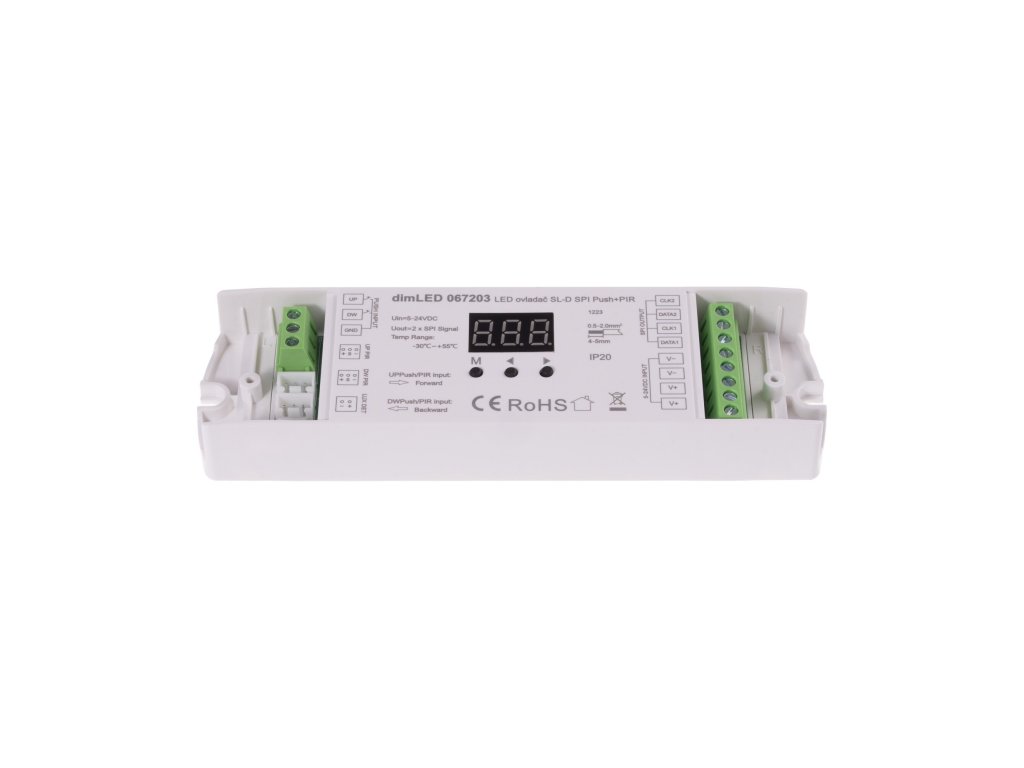 SPI ovladač s SPI výstupní signálem pro digitální LED pásky. Ovladačem dimLED SL-D SPI lze ovládat:Digitální jednobarevné LED pásky