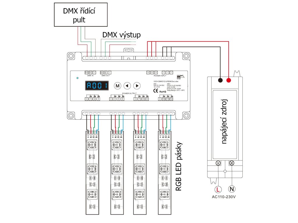 DMX512 12CH je 12ti-kanálový převodník určený pro ovládání LED systémů se společnou anodou pomocí DMX konzole, mezi které patří například jednobarevné a RGB pásky.