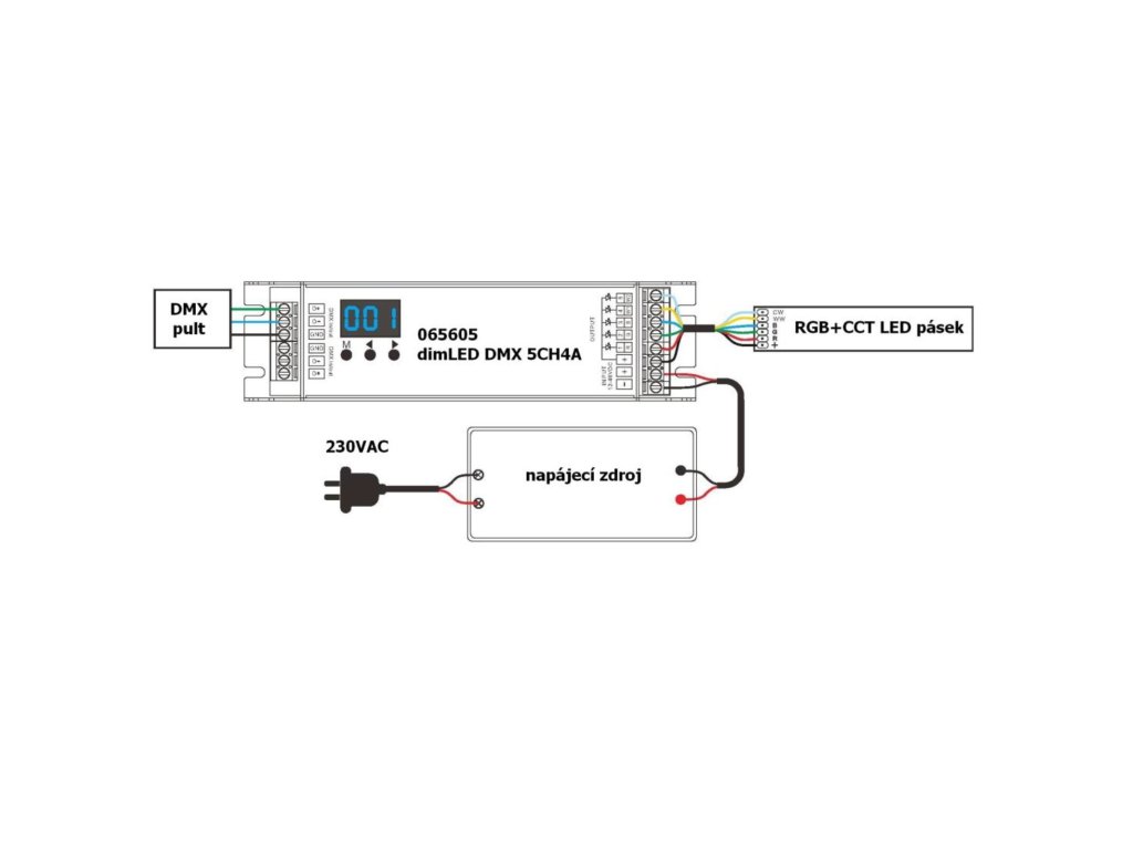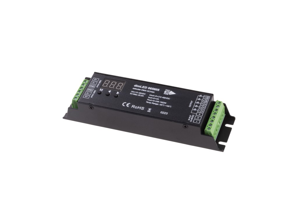 DMX 5CH4A dekodér je 5-kanálový převodník určený pro ovládání LED systémů se společnou anodou pomocí DMX konzole mezi které patří například jednobarevné, CCT, RGB, RGBW nebo RGBCCT LED pásky.Specifikace: