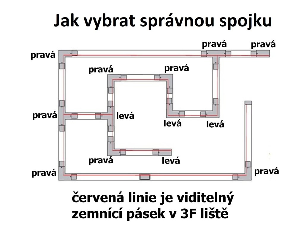 Nápomocný Vám může být i článek kolejnicový systém osvětlení. V galerii naleznete nákres s červenou čárou, který Vám pomůže s výběrem komponent. Červená čára zobrazuje zemnící vodič a aby komponenty do sebe zapadli, musí být vždy zemnící vodiče zapojovat proti sobě. Nákres zobrazuje pohled ze zěmě směrem na strop, tedy tak, jak bude instalace provedena již na stropě a Vy se na díváte.