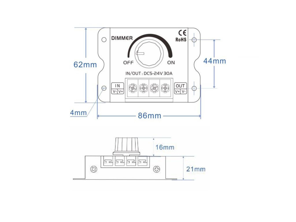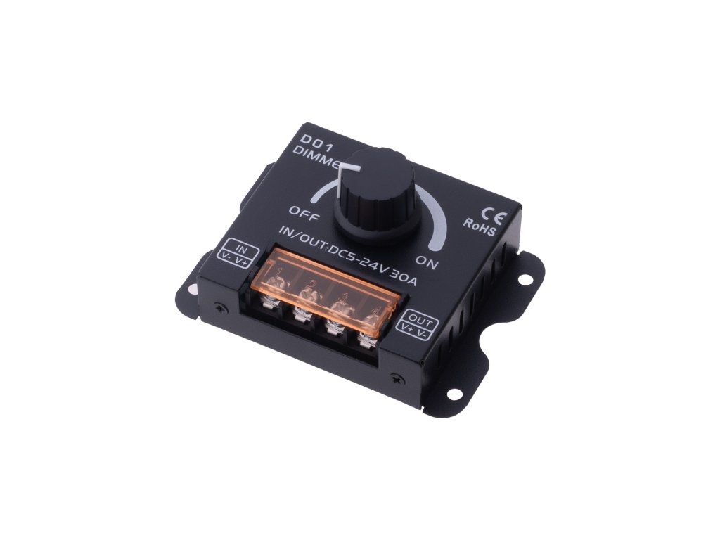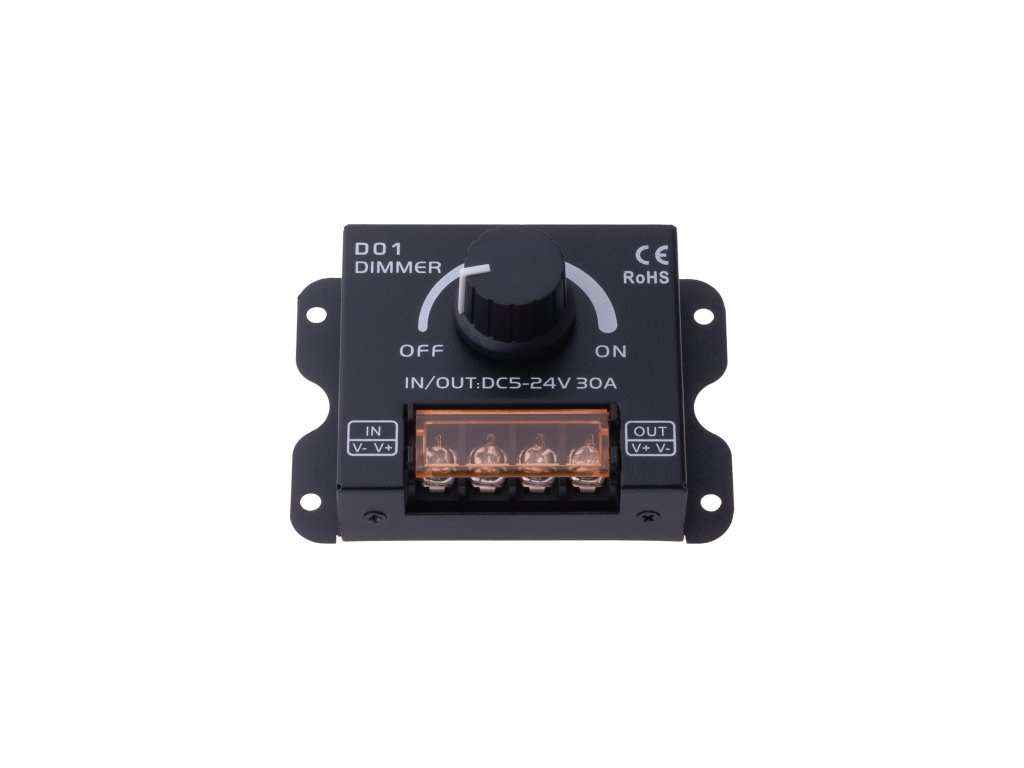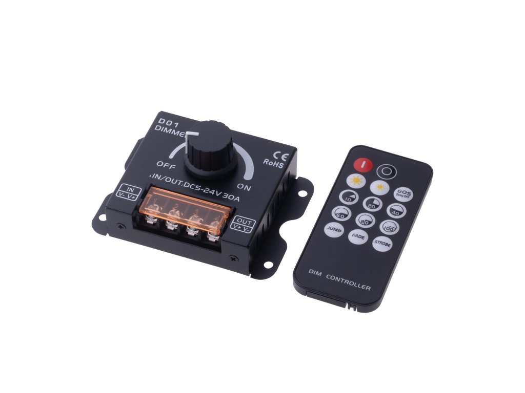 Stmívač a vypínač 1kanálový RF (radiofrekvenční) s dálkovým a manuálním ovládáním intensity jasu jednobarevných LED pásků, stmívatelných LED žárovek 5-24V a jednobarevných modulů. Přijímač může být ukrytý (za zdí, sádrokartónem či ve skříni), není nutná přímá viditelnost přijímače pro ovladač. LED ovladač RFM umožňuje ovládat 1 zónu samostatně. Světlo můžete ovládat jak dálkovým ovladačem, tak manuálně kolečkem na přijímači.