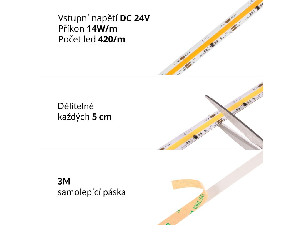 COB digitální jednobarevný LED pásek řízený čipem WS2811 a hustotou 420LED na 1 metr a napájecím napětím 24VDC. Každý modul je samostatně řiditelný (adresovatelný). Digitální LED pásek slouží k vytváření pokročilých světelných efektů v osvětlení. Na rozdíl od běžných LED pásků, které svítí jednolitě po celé své délce, tento digitální LED pásky umožňují individuální ovládání každého LED modulu zvlášť. K ovládání digitálních LED pásků je nutné použít k tomu určené ovladače nebo speciální řídící jednotky.