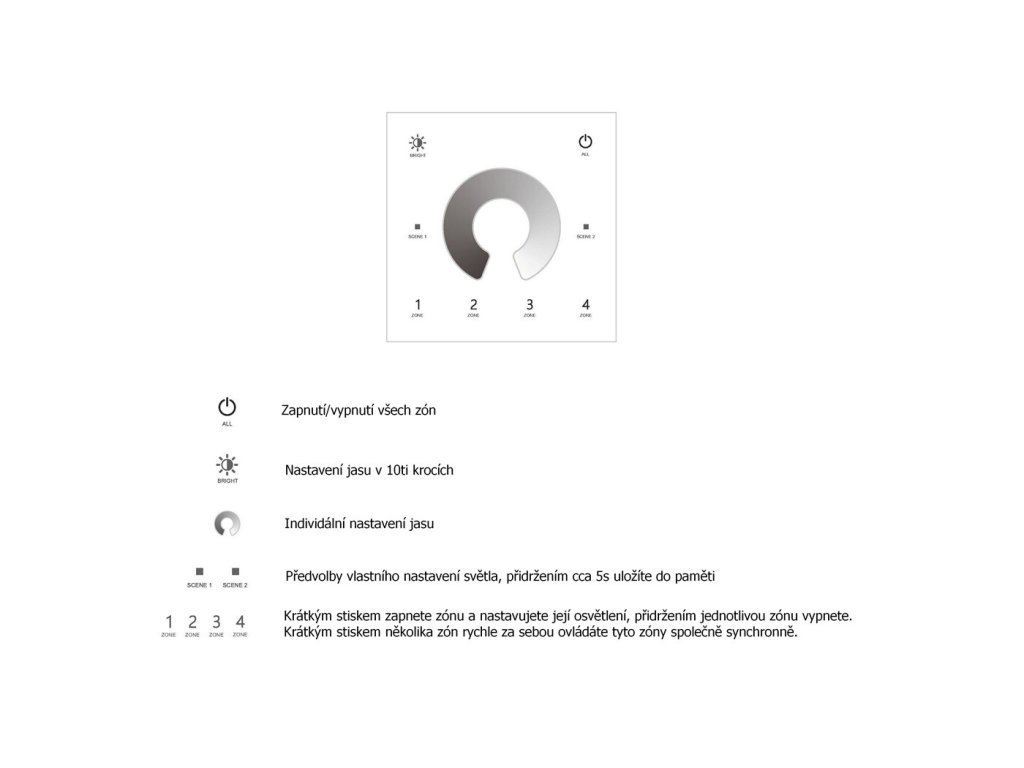 Ovládání probíhá na dotykové lince uprostřed ovladače. Dotykem na lince dochází k nastavování intenzity. Tlačítka na krajích ovladače slouží k dalším možnostem ovládání a vybírání zón.