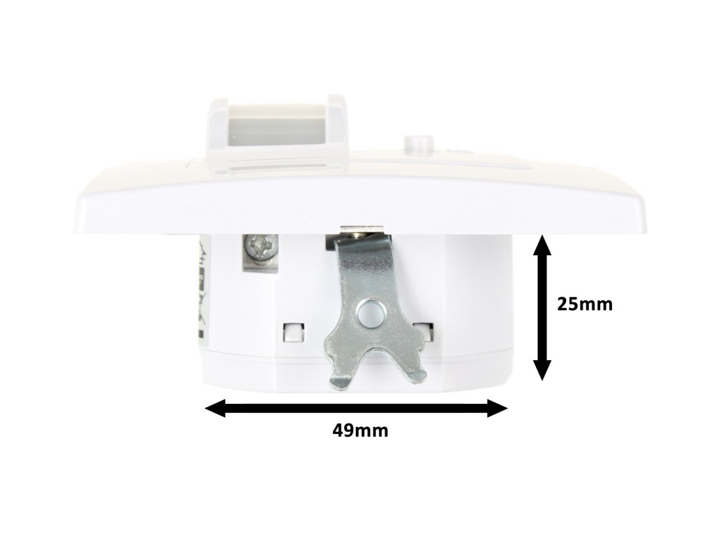 PIR pohybové čidlo pro instalaci do krabičky, které snímá pohyb na základě tepelného záření, jenž vyzařuje tělo v infračervené části spektra. Čidlo má vypínač, který umožňuje přepnutí ZAPNUTO-VYPNUTO-FUNKCE ČIDLA. Snímané pole čidla je horizontálně 160°. Čidlo po Vámi nastavené době rozepne, a pokud zaregistruje další pohyb, opět sepne. Po vypršení časového limitu můžete tedy být chvíli potmě. Pokud chcete, aby světlo během Vaší přítomnosti v místnosti nezhaslo, musíte použít tzv. detektor přítomnosti.