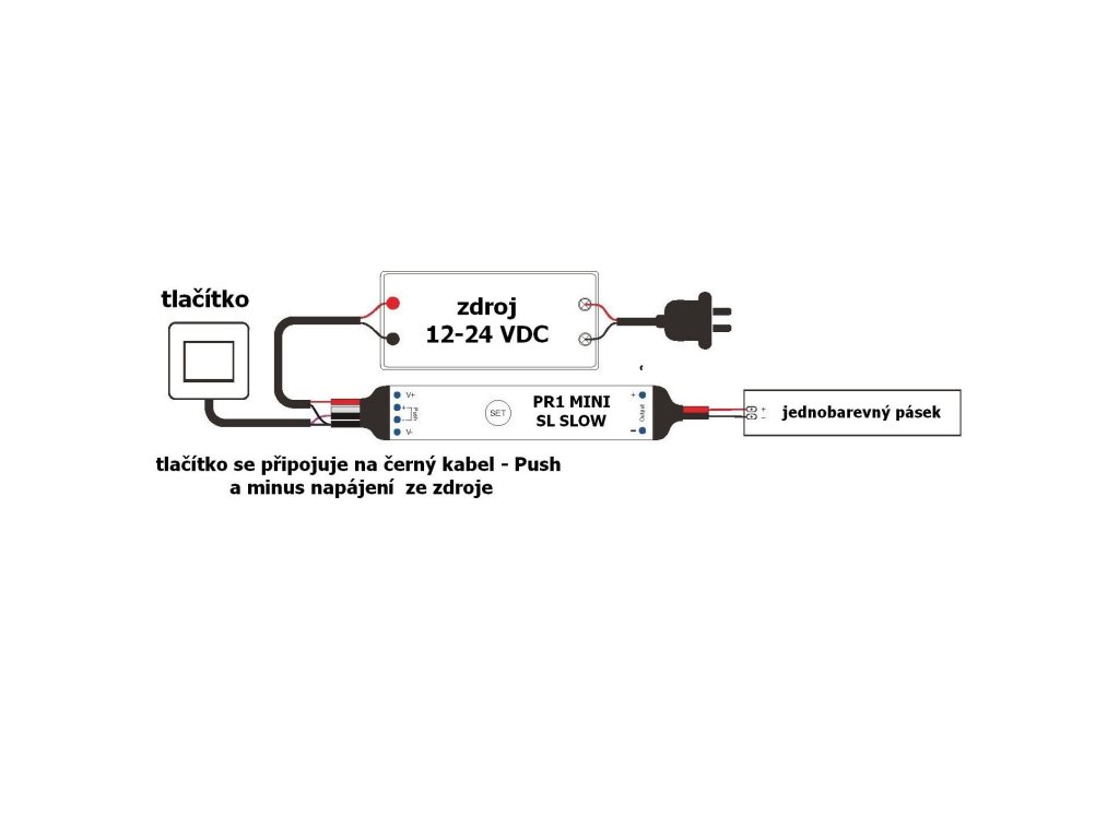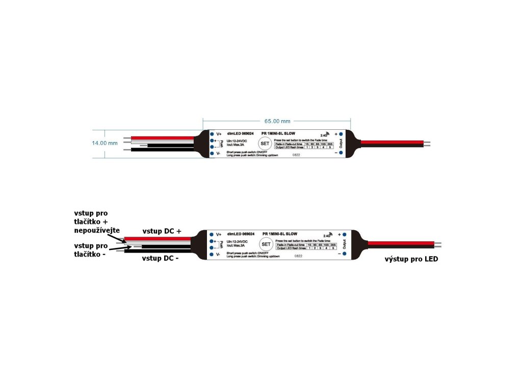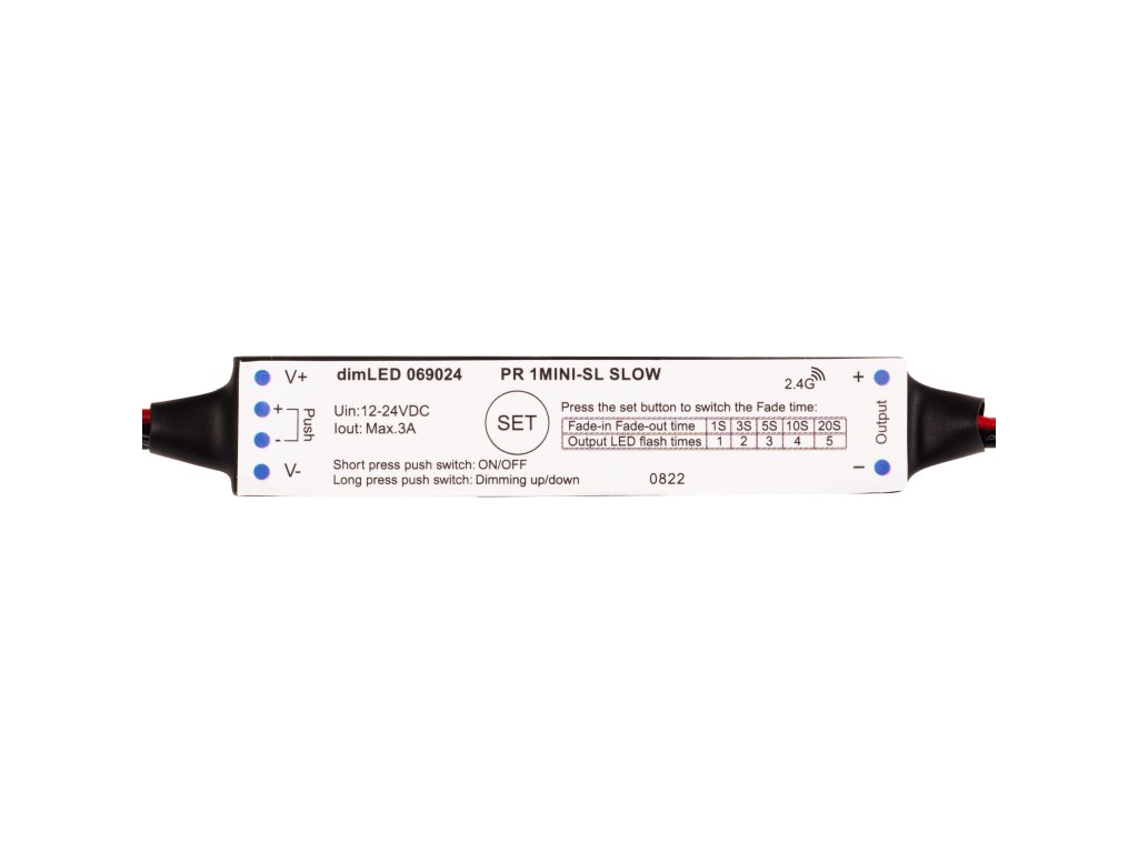 Přijímač dimLED PR 1MINI-SL SLOW je radiofrekvenční přijímač stmívač pro LED produkty. Přijímač může být ukrytý (za zdí, sádrokartónem či ve skříni), není nutná přímá viditelnost přijímače pro ovladač. Přijímač je kompatibilní se všemi ovladači řady dimLED. Přijímač má kabely pro připojení tlačítka, kterým lze přijímač manuálně ovládat. Lze tedy přijímač ovládat jak dálkově, tak manuálně například tlačítkem.Pro ovládání více okruhů je nutno použít jeden přijímač na každý okruh. Na každý přijímač lze napárovat až 10 různých ovladačů řady dimLED a tak ovládat z několika míst. V případě přerušení a poté opětovného připojení napájení (například přerušením napájení zdroje) má tento přijímač paměť nastavení intenzity (intenzita osvětlení se vrátí na naposled nastavenou).