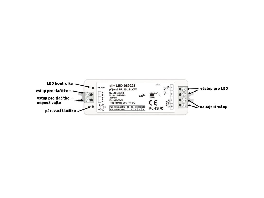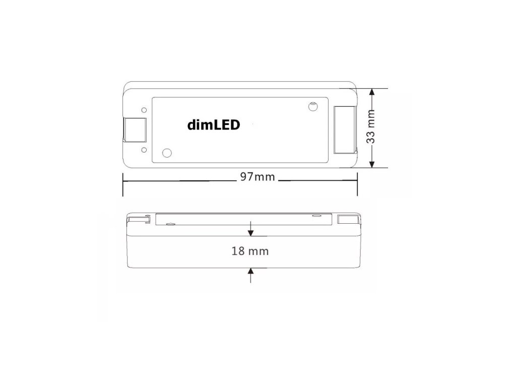 Radiofrekvenční přijímač stmívač pro LED produkty. Přijímač může být ukrytý (za zdí, sádrokartónem či ve skříni), není nutná přímá viditelnost přijímače pro ovladač. Přijímač je kompatibilní se všemi ovladači řady dimLED !!! Přijímač má svorkovnici pro připojení tlačítka, kterým lze přijímač manuálně ovládat. Lze tedy přijímač ovládat jak dálkově, tak manuálně například tlačítkem. Pro ovládání více okruhů je nutno použít jeden přijímač na každý okruh. Na každý přijímač lze napárovat až 10 různých ovladačů řady dimLED a tak ovládat z několika míst.