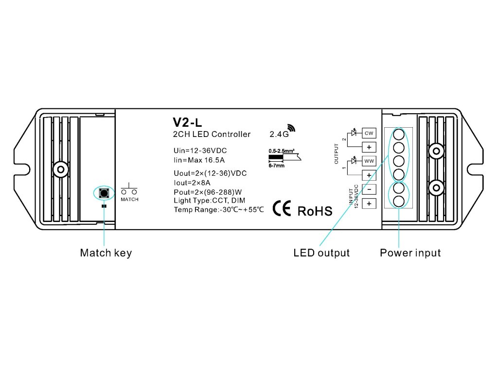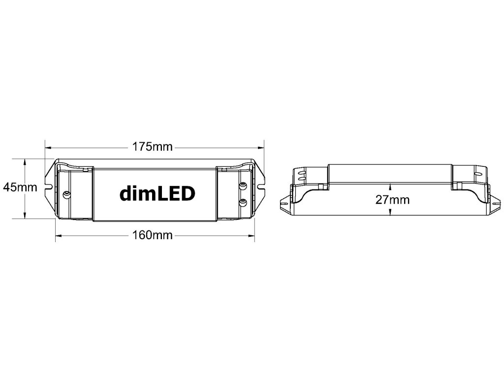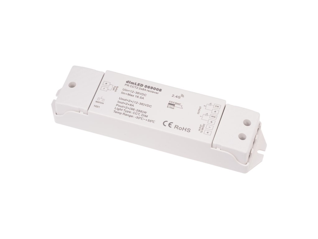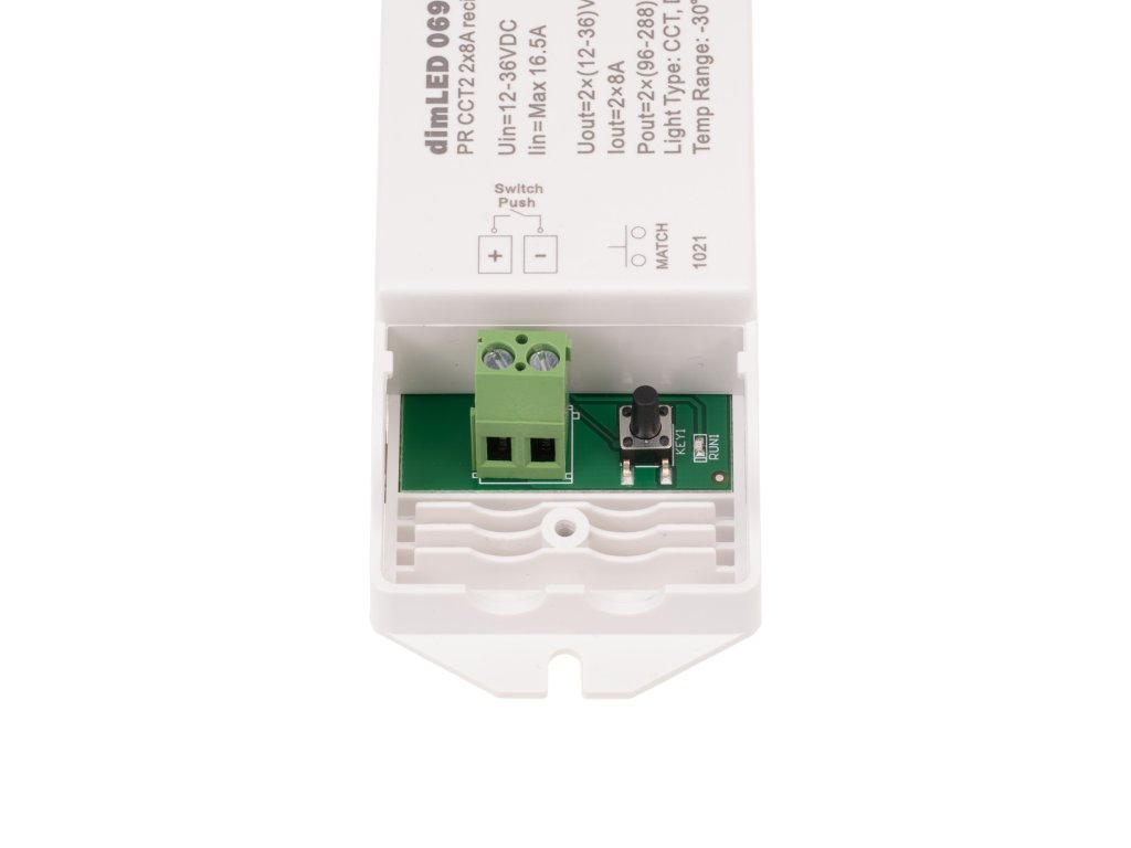 Radiofrekvenční přijímač stmívač pro CCT LED produkty. Přijímač může být ukrytý (za zdí, sádrokartónem či ve skříni), není nutná přímá viditelnost přijímače pro ovladač.Přijímač dimLED PR CCT2 má 2 výstupy a lze ovládat pomocí příslušného dimLED ovladače: