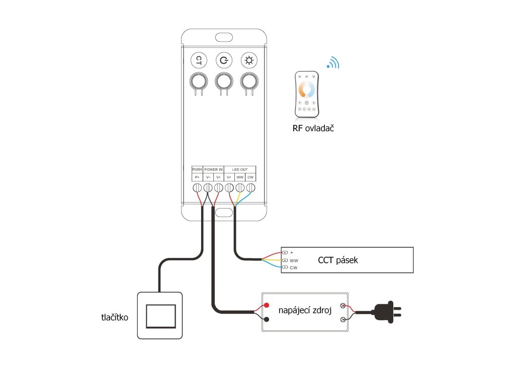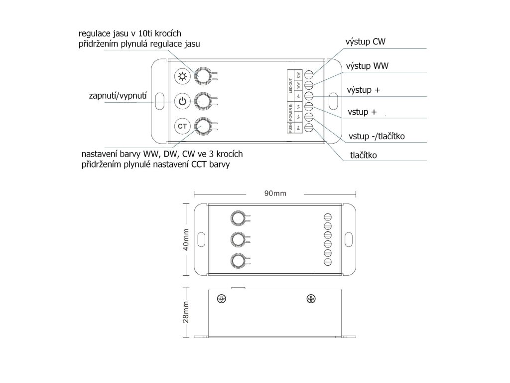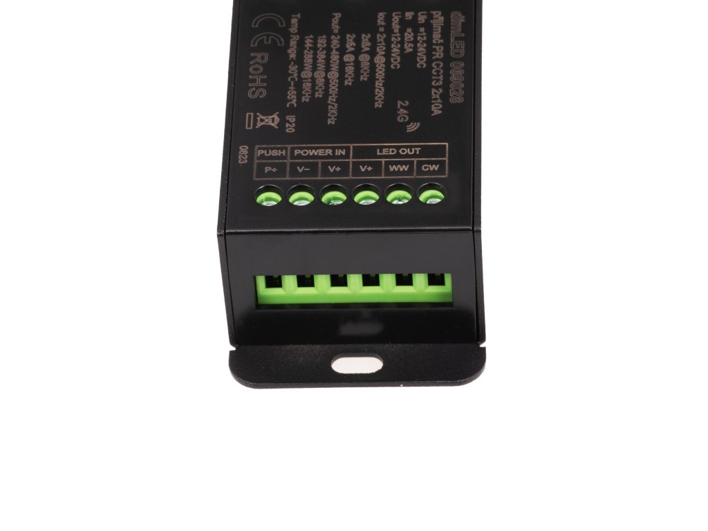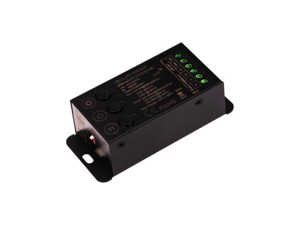 Radiofrekvenční přijímač stmívač pro CCT LED osvětlení s napětím 12-24V DC. Přijímač je kompatibilní se všemi ovladači řady dimLED. Přijímač může být ukrytý (za zdí, sádrokartónem či ve skříni), není tedy nutná přímá viditelnost přijímače pro ovladač. Přijímač má svorkovnici pro připojení tlačítka, kterým lze přijímač manuálně ovládat (zapínat, vypínat a stmívat). Přijímač lze tedy ovládat jak dálkově pomocí ovladače do ruky, tak manuálně externím tlačítkem. Na samotném přijímači jsou také 3 tlačítka pro vypnutí/zapnutí. Pro ovládání více okruhů je nutno použít jeden přijímač na každý okruh. Na každý přijímač lze napárovat až 10 různých ovladačů řady dimLED a tak ovládat z několika míst najednou. V případě přerušení a poté opětovného připojení napájení (například přerušením napájení zdroje) má tento přijímač paměť nastavení intenzity (intenzita osvětlení se vrátí na naposled nastavenou).Tento model přijímače dimLED umožňuje nastavit 4 hodnoty PWM frekvence. S vyšší frekvencí klesá výstupní proud, nicméně vyšší frekvence je vhodná pro instalace například s kamerami (no flicker pro video). Hodnoty frekvencí a výstupního proudu jsou: