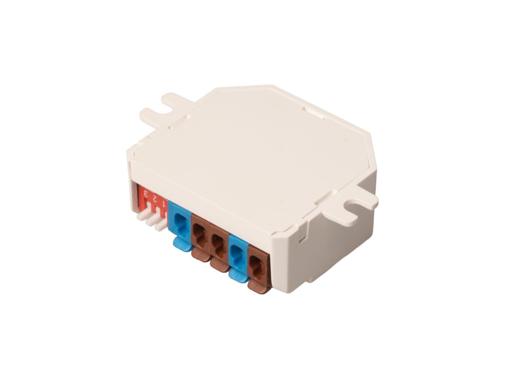 Kompaktní RF přijímač stmívače pro jednobarevné LED osvětlení s napětím 12–48 V DC. Díky velmi malým rozměrům 56*38,5*18 mm jej lze snadno skrýt za zeď, do sádrokartonu nebo pod vypínač, takže není nutná přímá viditelnost mezi ovladačem a přijímačem.Přijímač je plně kompatibilní se všemi ovladači řady dimLED. K dispozici je svorkovnice pro připojení externího tlačítka, pomocí kterého lze osvětlení ovládat manuálně (např. při umístění přijímače pod vypínač). Ovládání je tak možné bezdrátově dálkovým ovladačem i klasickým tlačítkem.