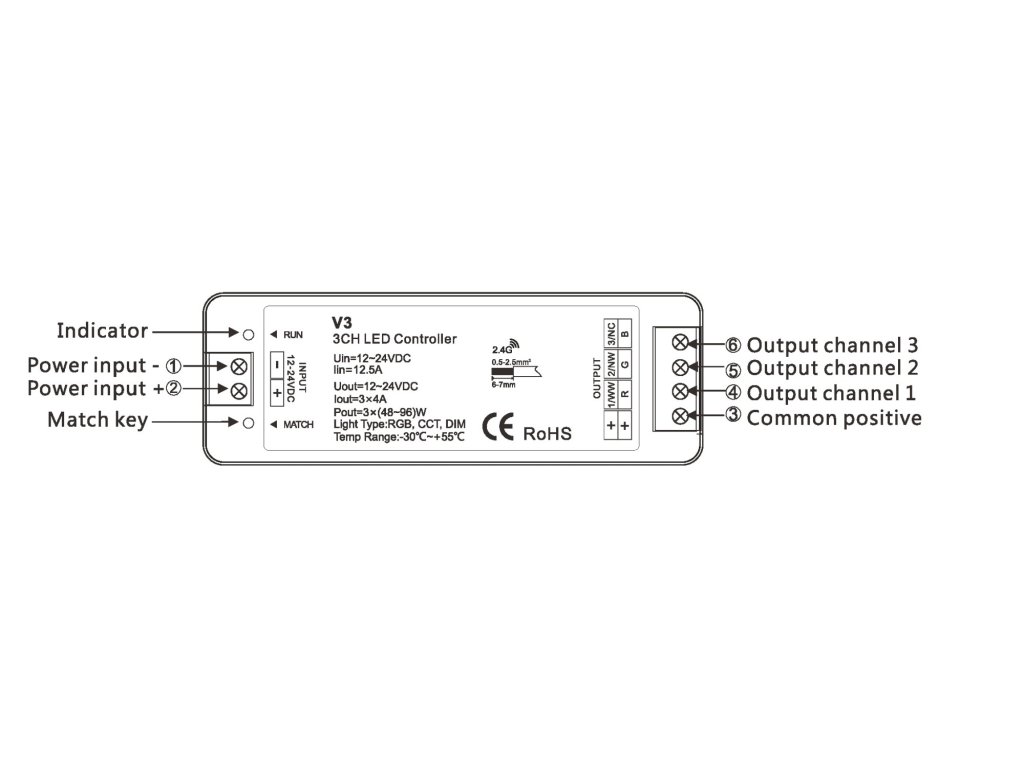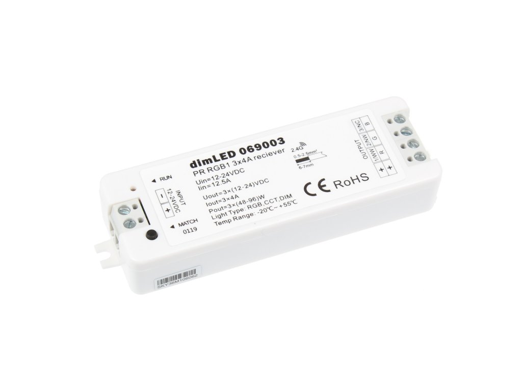 Radiofrekvenční přijímač stmívač pro RGB, CCT a jednobarevné LED produkty. Přijímač může být ukrytý (za zdí, sádrokartónem či ve skříni), není tedy nutná přímá viditelnost přijímače pro ovladač.Přijímač dimLED PR RGB1 má 3 výstupy a lze ovládat pomocí příslušného dimLED ovladače: