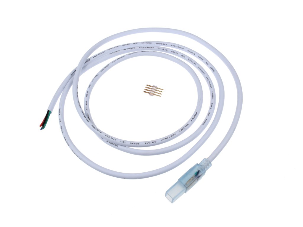 Přípojka pro LED RGB pásek 230V. Slouží k připojení LED RGB pásku k ovladači.Celková délka přípojky je 200 cm. Součástí je i trn, který se nastrčí do LED RGB pásku a na něj se přípojka nasadí.