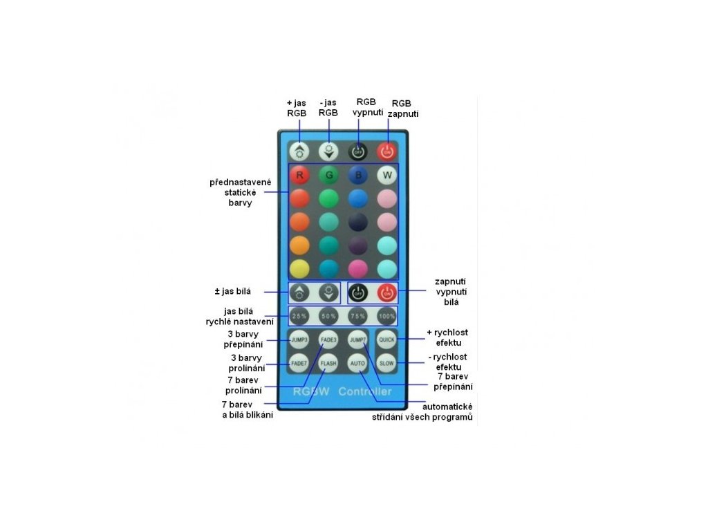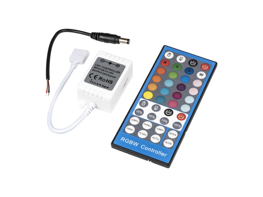 LED ovladač RGBW-RF40B 8A je bezdrátový radiofrekvenční ovládací systém pro LED pásky RGBW a nebo pro kombinaci RGB a jednobarevného pásku. Buď svítí samostatně RGB, nebo bílá. Nelze svítit současně bílou a RGB.