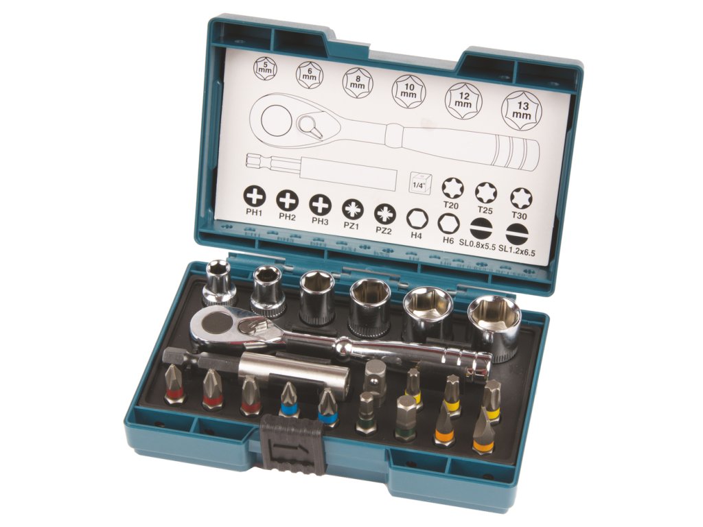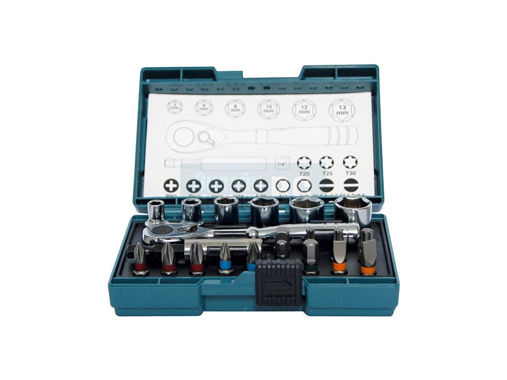 Sada bitů a nástrčných klíčů šestihran 1/4", 21 ks. Sada obsahuje ráčnu, držák bitů, bity 25 mm PH1, 2, 3, PZ1, 2, TX20, 25, 30, plochý 0.8 x 5.5, 1.2 x 6.5, imbus 4/6 a nástrčné klíče SW5, 6, 8, 10, 12, 13. Sada je dodávaná v plastové krabičce.Doplňkové parametry