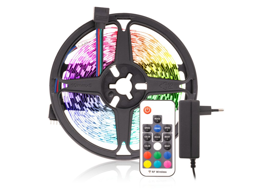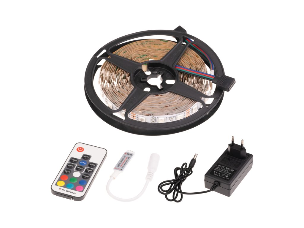 Sada LED pásku 12V-5M9W-RGB za příznivou cenu, která je určená především pro domácí použití. Kompletní sada RGB LED pásku obsahuje 5m RGB LED pásku, adaptérem do zásuvky a dálkový RF ovladač. LED pásek, adaptér i ovladač jsou opatřeny konektory pro jednoduché propojení mezi sebou. LED pásek je podlepen samolepící páskou, abyste ho mohli nalepit LED pásek na místo Vaší instalace. LED pásky v sadě můžete zkracovat po 5cm modulech. Vhodné jako podsvícení pro Vaše interiéry v místech jako jsou kuchyňské linky, komody apod.RGB LED pásek Vám umožňuje kombinovat červenou, zelenou a modrou barvu a osvětlit si Vaši domácnost dle Vašich požadavků.