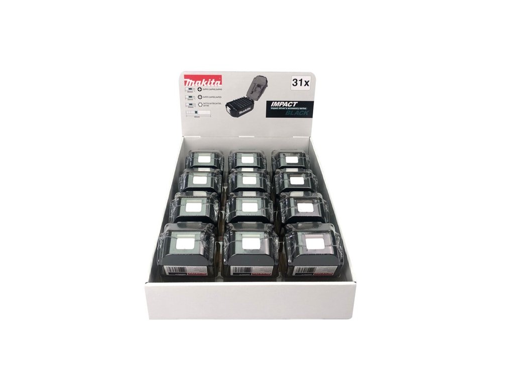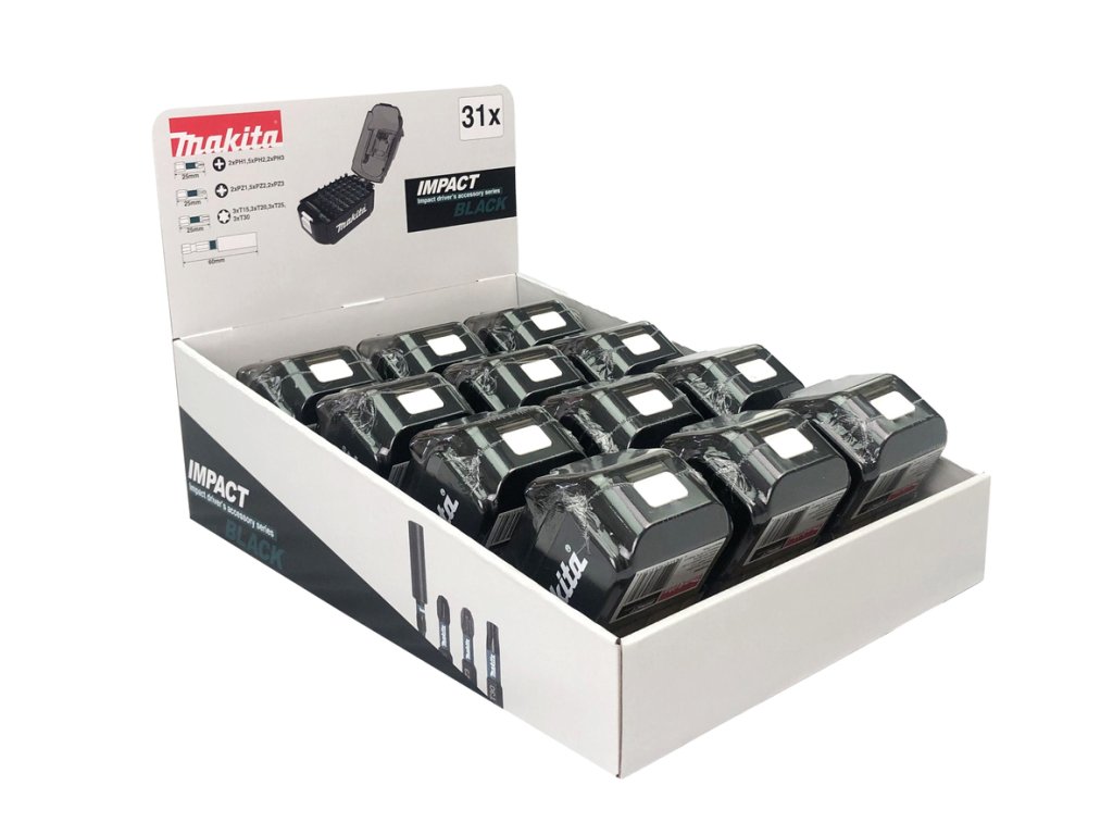 Sada 12 ks sad ve tvaru baterie. Každá sada obsahuje 30 ks bitů Impact Black o délce 25 mm - PH1 (2 ks), PH2(5 ks), PH3 (2 ks), PZ1 (2 ks), PZ2 (5 ks), PZ3 (2 ks), T15 (3 ks), T20 (3 ks), T25 (3 ks), T30 (3 ks) a držák bitů 60 mm. 12 ks sad v balení.Doplňkové parametry
