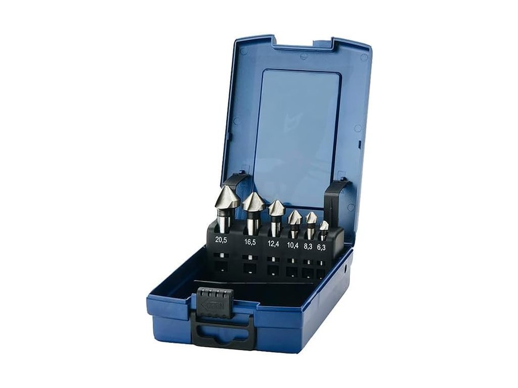 Sada záhlubníků z rychlořezné oceli HSS určené pro vrtání legované i nelegované oceli. Balení 6 ks, obsahuje záhlubníky o průměru 6.3, 8.3, 10.4, 12.4, 16.5, 20.5 mm. Dodáváno v plastové krabičce.Doplňkové parametry