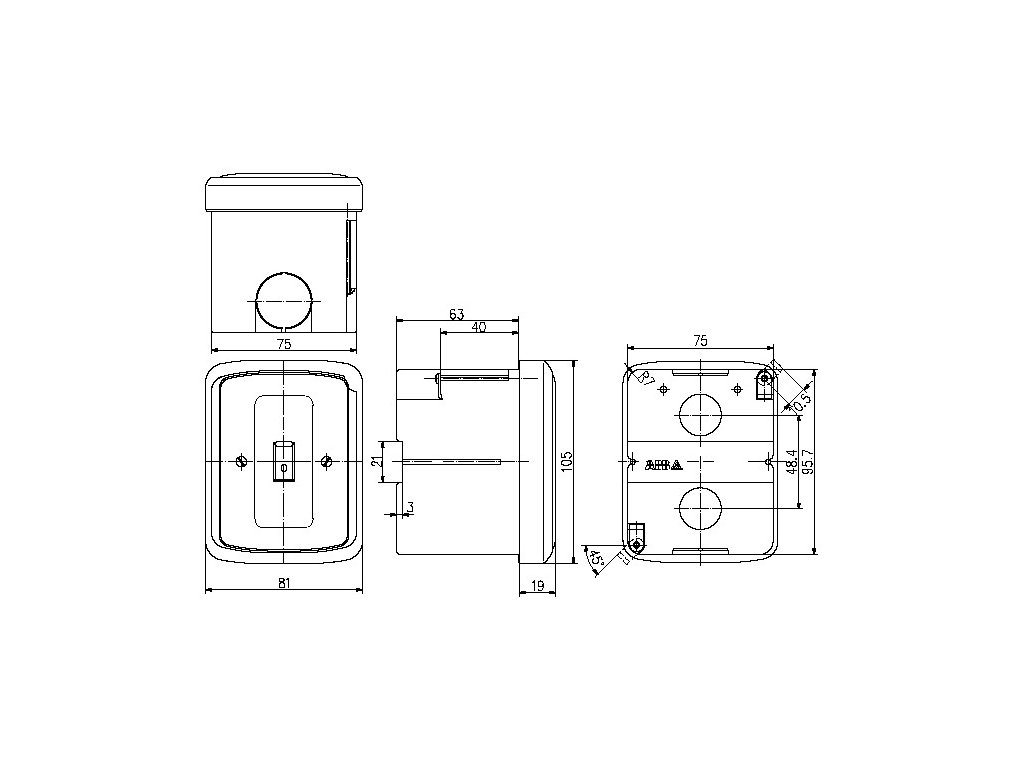 Spínač trojpólový páčkový zapuštěnýS instalační krabicí a upevňovací sponou.