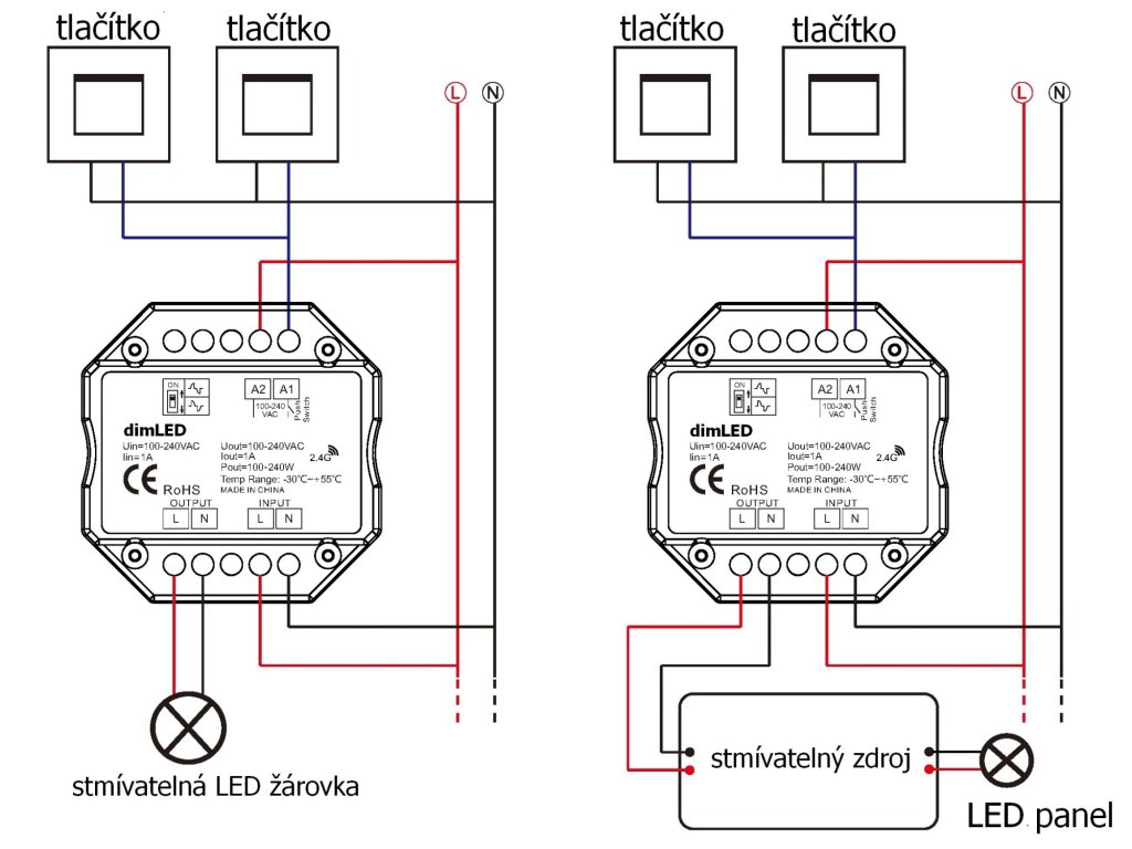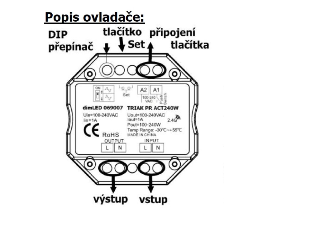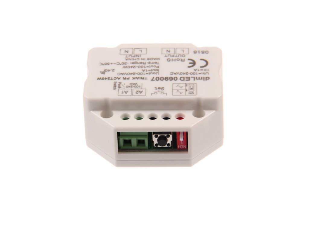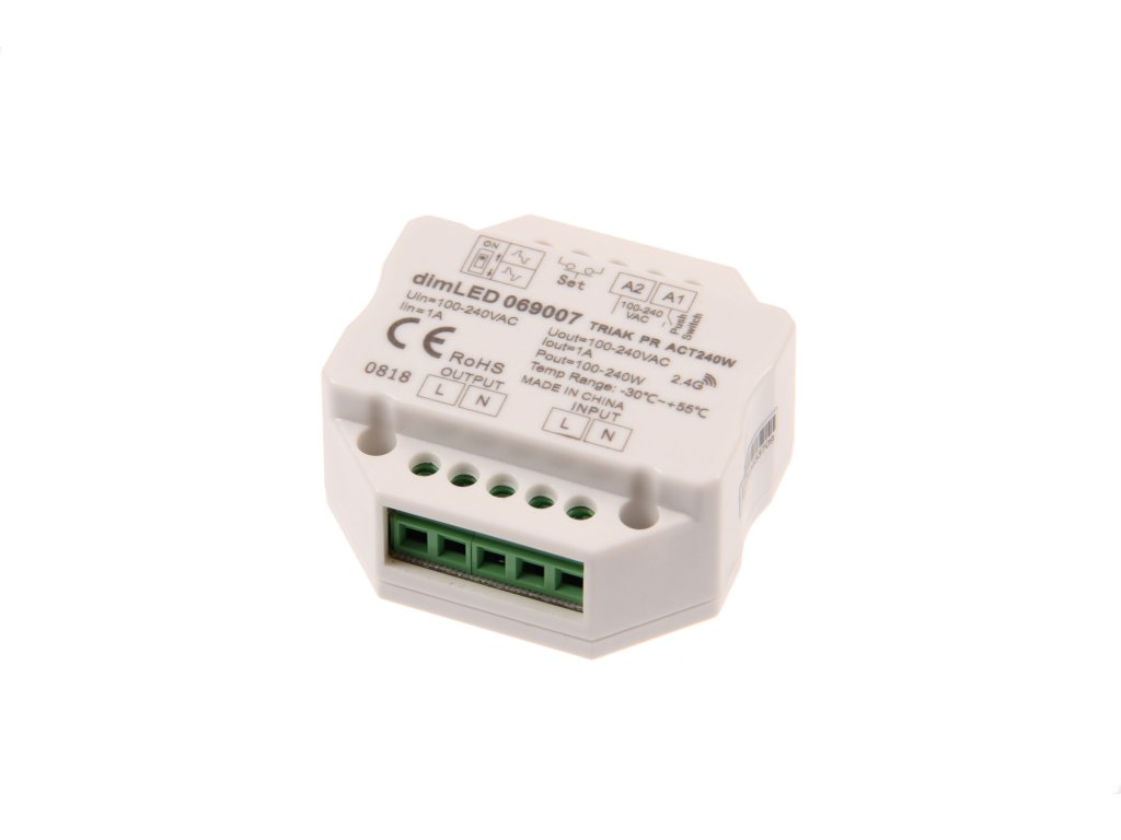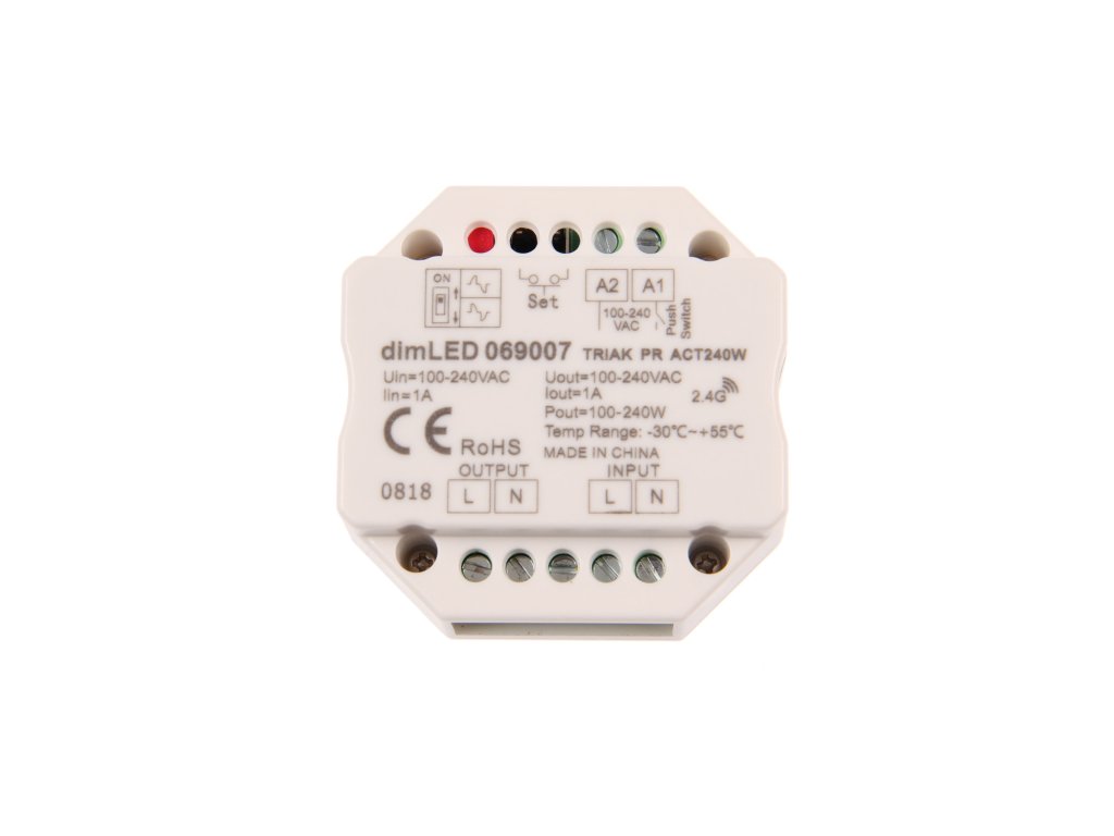 Stmívač a přijímač pro stmívatelné LED žárovky a panely na 230V s možnost použití tlačítka pod vypínače Vaší řady. Lze ovládat i různými druhy dálkových ovladačů řady dimLED z naší nabídky, kterými můžete zároveň ovládat i systémy na 12 či 24V jako LED pásky apod. Vše tedy poté můžete řídit jedním ovladačem a nemusíte mít poté například na LED pásky a žárovky 2 různé ovladače. Díky těmto možnostem patří mezi špičku na našem trhu.Tento model ovladače umožňuje nastavení minimálního svitu. Stmívač je elektronický pro stmívání 0-100%, nicméně některé stmívatelné světelné zdroje většinou nejsou konstruovány pro plné stmívání 0-100%. Při nastavení stmívače na 0% či jinou nízkou hodnotu se může stát, že některá svítidla nefungují správně (například po vypnutí stmívače opětovném zapnutí nedojde k vybuzení zdroje a je nutné na stmívači přidat hodnotu jasu pro rozsvícení). Řešení je najít na světle polohu, kam na minimum stmívat před vypnutím, nebo nastavit minimální hodnotu svitu.