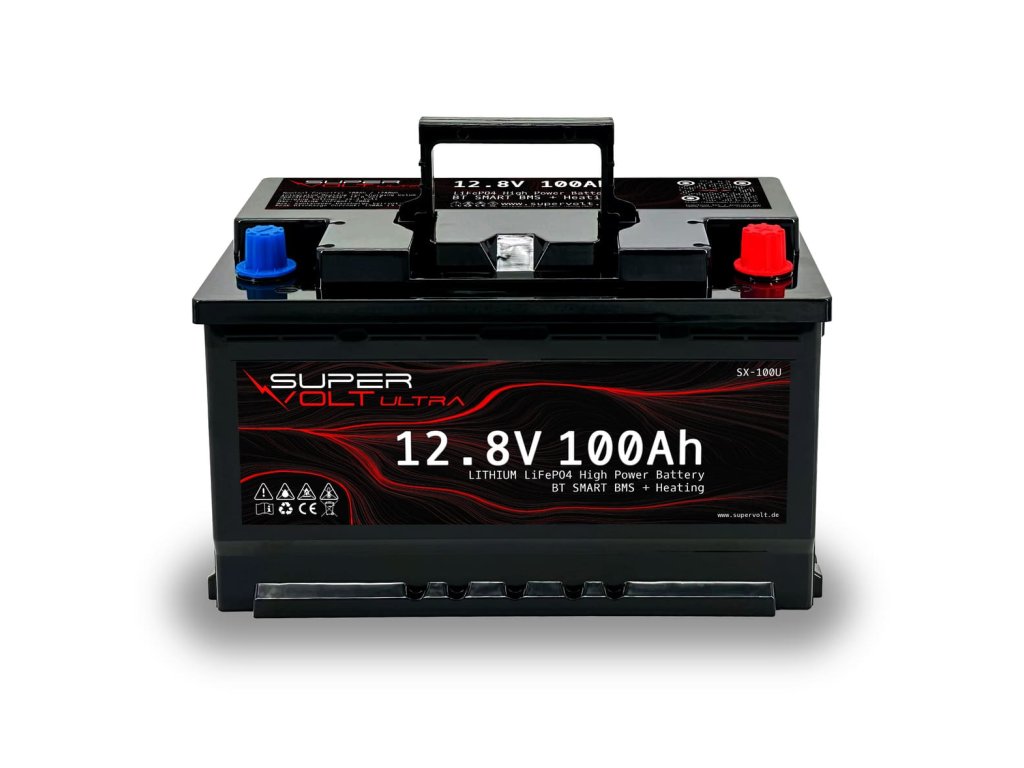 Supervolt Ultra – 12,8V 100Ah – LifePO4 s Bluetooth a vyhřívánímNaše 100ah Supervolt Ultra vysoce výkonná baterie je elektrárna plná inovativních technologií. Tato vysoce výkonná LiFePO4 baterie 12,8 V 100 Ah s hmotností pouhých 10,1 kg představuje významnou úsporu hmotnosti ve srovnání s běžnými olověnými bateriemi.