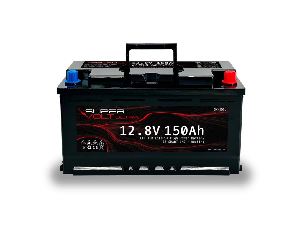 Supervolt Ultra – 12,8V 150Ah – LifePO4 s Bluetooth a vyhřívánímNaše 150ah Supervolt Ultra vysoce výkonná baterie je elektrárna plná inovativních technologií. Tato vysoce výkonná LiFePO4 baterie 12,8 V 150 Ah s hmotností pouhých 15,9 kg představuje významnou úsporu hmotnosti ve srovnání s běžnými olověnými bateriemi.