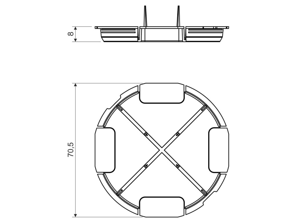 - Rozměry: Víčko je navrženo pro standardní elektroinstalační krabice s rozměrem 68 mm, což je běžná velikost pro montážní otvory v elektroinstalačních systémech.