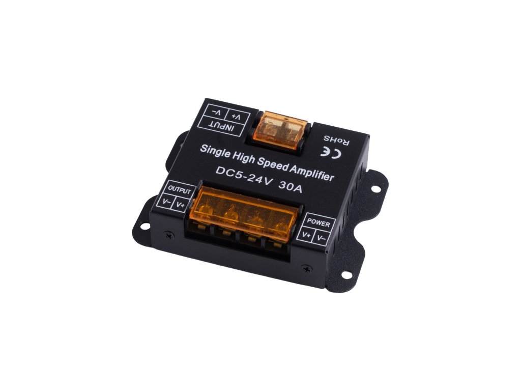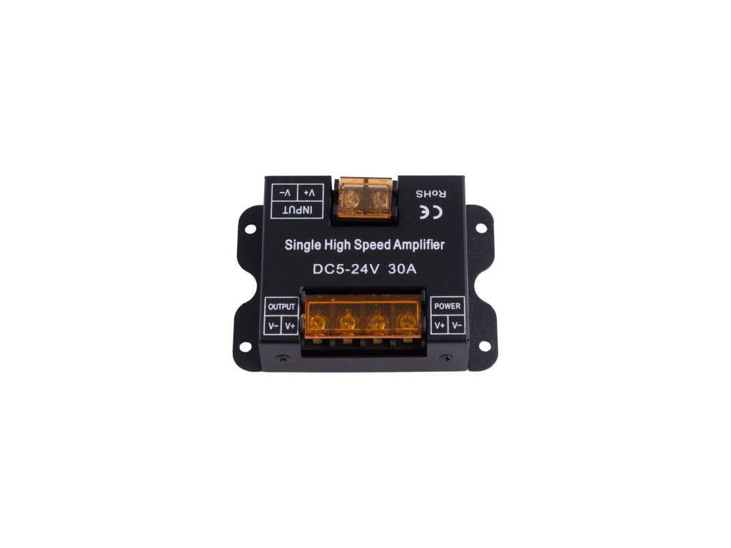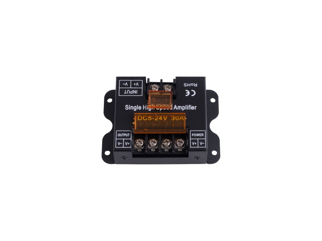Zesilovač signálu jednokanálový pro jednobarevné LED produkty jako jsou LED pásky nebo LED moduly. Slouží k rozšíření výkonů LED ovladačů nad jejich přípustné zatížení. Například k ovladači s max. zatížením 72W připojením zesilovače přidáte další úsek o 360W. Pozor, hodnoty se nesčítají. Na zesilovač můžete připojit pouze doporučené zatížení.